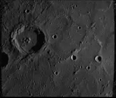 ![]() Mariner 10 image of Zola crater. Note the complex of peaks within the crater. North is up. | |