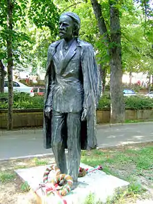 The city of Pécs commissioned a full-length bronze statue, located in Szent István square, in his honour in 1976. According to the wishes of the sculptor, the work stands with its back to the Cathedral and facing a former playground, so that it was facing children, whose musical education was the most important thing in Kodály's life. He is depicted as a fragile old man, who walks almost imperceptibly among the horse-chestnut trees.[8]