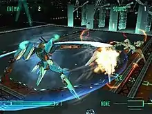 The game's fighting system was praised for its use of 3D camerawork and Jehuty's fast movements.[3][38] GamePro found it superior to the PlayStation 2's other mecha game released by the release, Armored Core 2 thanks to its responsive controls and quick combat.[37] The visual design has also been praised as highly detailed.[41][40] The game was critically acclaimed by Justin Leeper of Game Informer, who remarked Zone of the Enders as one of the most appealing games and found its visuals as ones of the best ones ever found in the PlayStation 2 and added praise to its fighting.[36] However, the presentation has been a major area of criticism; the game's localization was criticized, with the English script being regarded as repetitive and the voice acting "emotionless" by David Smith, writing for IGN. He also reported being annoyed by Leo's English voice acting.[41] The story has been disliked by reviewers with Smith finding the main characters inferior to the ones from other mecha series such as Mobile Suit Gundam whereas Snackdawg of GameZone disliked the story as he stated that despite its dark parts such as the deaths of Leo's friends, his father and his friend being shot, it instead made everyone "simply seems whiny".[41][40] While liking the game, Leeper recommended players to skip the cutscenes.[36] Despite these complaints, Smith considered it one of the best mecha games he had ever played.[41]