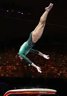 In August, Kovács competed at the European Championships in Munich, where she was considered to be one of the favorites to medal in the all-around.[23] However, in the qualification round of the competition, which also determined the all-around results, she fell twice on the balance beam and also fell on her uneven bars dismount.[24] Despite the falls, she managed to score 52.765, finishing ninth in the all-around. Additionally, she qualified to the vault final in first place as well as the floor final in seventh place, and helped Hungary qualify to the team final.[25] Hungary finished seventh in the team final.[26] In the vault final, Kovács won the gold medal ahead of Asia D'Amato and Aline Friess, taking her second European title on the event. In the floor final, she fell on her third tumbling pass and placed eighth.[27]